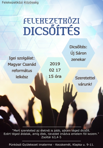 Szeretettel hívnak és várnak mindenkit a szervezők február 17-én vasárnap 15 órakor a következő felekezetközi dicsőítő alkalomra, ami a Pünkösdiek imatermében, a Klapka utcai Gabonaszékház első emeletén lesz.